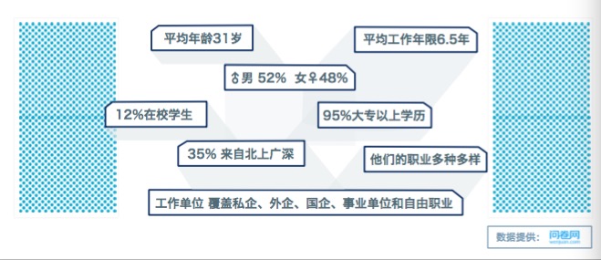 本次访问涉及的3488名被访者,平均年龄为31岁。其中男性占比52%,女性占比为48%。95%的人拥有大专以上学历,35%来自北上广深等一线城市。他们之中85%的人已经参加工作,12%为在校学生。工作的人平均工作年限6.5年,职业多种多样,工作单位则覆盖私企、外企、国企、事业单位和自由职业。