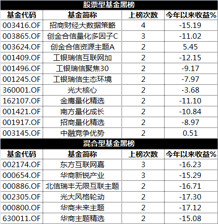 从上述基金的重仓股明细来看,不论是港股还是A股投资,白马股成为上半年业绩的关键。下面再来看下多次登上黑榜的基金名单: