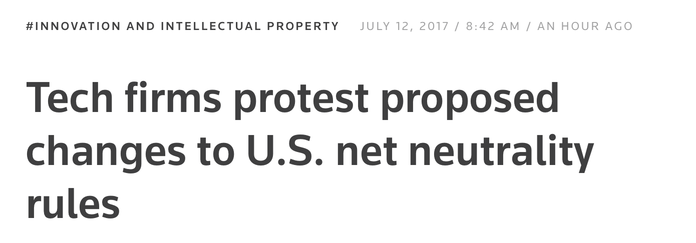 【科技公司抗议美取消网络中立原则】包括Facebook、Twitter、Alphabet在内的8万多家科技公司周三在网络上抗议,反对美国取消网络中立原则。