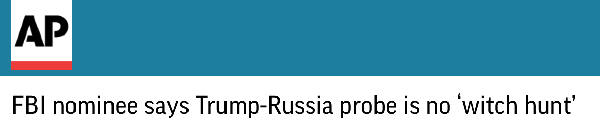 特朗普多次将“通俄门”调查称为“恶作剧”(hoax)和“莫须有的政治迫害”(witch hunt)。上个月被提名的雷表示他并不同意这些说法。雷誓言将领导FBI“不受任何政治党派的干扰”,并且任何影响曾任FBI局长的调查小组负责人穆勒(Robert Mueller)工作的事情都是不可接受的。