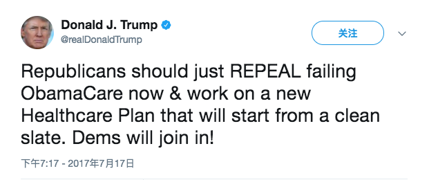 据路透社报道,周三,特朗普邀请49名参议员在白宫共进午餐,并表示他希望废除奥巴马医改并同时替代它(废除和替代)。而就在一天前,特朗普还在推特上说,共和党人现在应该只废除奥巴马医改,然后再从头开始(慢慢)制定一个全新的医保方案(废除和延迟)。