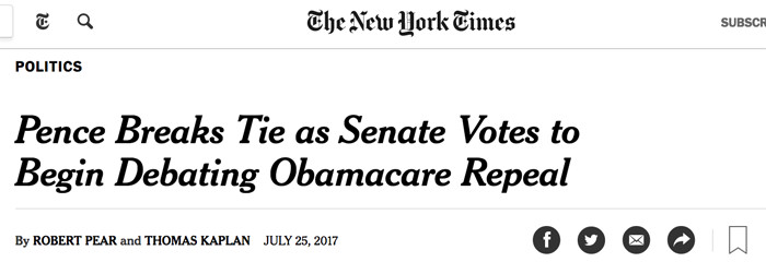 【彭斯投票打破平局,美国新医改法案辩论将正式开始】美国参议院周二进行投票,结果以51:50支持对废除平价医疗法案开始进行辩论。被诊断出脑癌的麦凯恩出席,进行投票。最终副总统彭斯投票打破50:50平局,参议院得以继续讨论。这次结果是总统特朗普的初步胜利。特朗普在白宫玫瑰园新闻发布会上表示:这是重要的一步,美国人民正迎来真正伟大的医保体系。