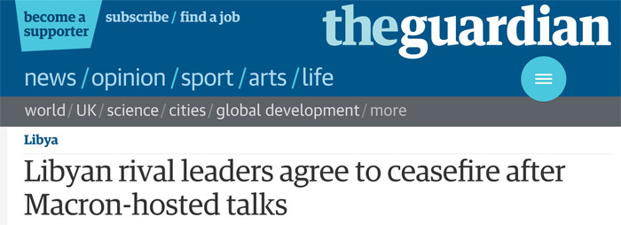 【利比亚敌对领导人达成停战协议】在由法国总统马克龙主持的会谈中,利比亚受联合国支持的总理萨拉杰和控制着东部大片土地的军方强人哈福特达同意停火,并初步计划于明年进行选举。马克龙表示周二的会谈在和平议题上取得了很大的进展。此次协议被视为以政治方式解决多年战乱的重要一步,但有鉴于自2011年卡扎菲垮台以来,各方的和平协定都没有被遵守,且此次也没有对明年的选举定下具体日期,因此前景难以预料。