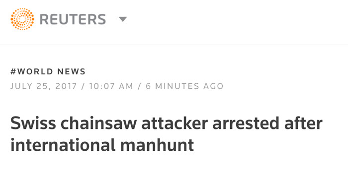 【瑞士电锯袭击者被捕】瑞士警方逮捕了一名50岁的嫌疑人,结束了与德国警方共同参与的国际追捕。两天前,该男子冲进一家保险公司办公室,手持电锯,致伤两名工作人员。苏黎世地方警方在声明中表示,已在案发地点60公里外名为Thalwil的城市逮捕了嫌疑人Franz Wrousis。该嫌疑人多数时间住在树林中,有犯罪记录,作案动机未知。