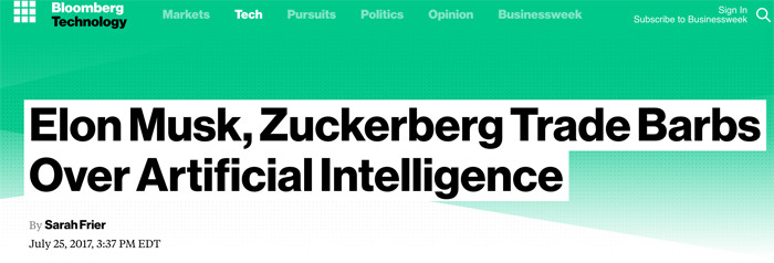 【马斯克、扎克伯格就人工智能产生分歧】本月早些时候,特斯拉首席执行官马斯克在公开场合演讲时要求在机器人变得比制造者更聪明、威胁人类之前,对人工智能进行积极监管。而在上周日被问及对这一看法的观点时,Facebook首席执行官扎克伯表示:“那些质疑者、鼓动这些末日情景的人,我真的不理解……这很消极,从某种程度来说,我认为这是很不负责任的。”马斯克随后在推特上反击称,扎克伯格对人工智能的理解是有限的。