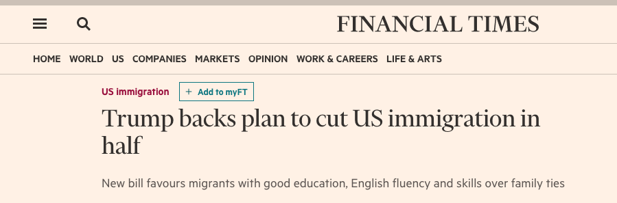 特朗普同该草案的起草人、来自阿肯色州的汤姆·柯顿和乔治亚州的戴维·珀杜两位共和党议员共同呼吁一个新的移民评分系统,该系统支持那些受到更好教育、英语更加流利和具备更好工作技能的移民候选人。