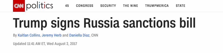 报道称,该法案通过赋予国会否决权以限制特朗普撤销对俄制裁,此举相当于给了特朗普一记耳光。