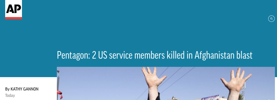 【两名美国士兵在阿富汗爆炸中丧生】五角大楼发言人表示,当地时间周三,阿富汗南部地区发生一场针对北约车队的自杀性爆炸袭击,袭击导致两名美国士兵死亡。目前还没有任何信息显示受伤士兵的数量。然而,驻阿富汗美军始此前终拒绝透露在这场声称由塔利班领导的袭击中是否有人丧生。