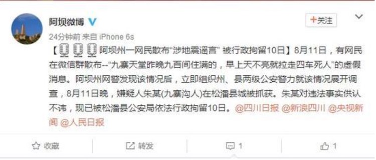 【四川】网民散布“九寨沟拉走四车死人”谣言被拘10日