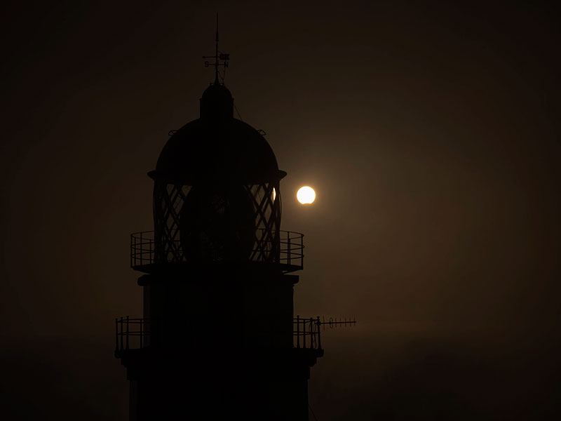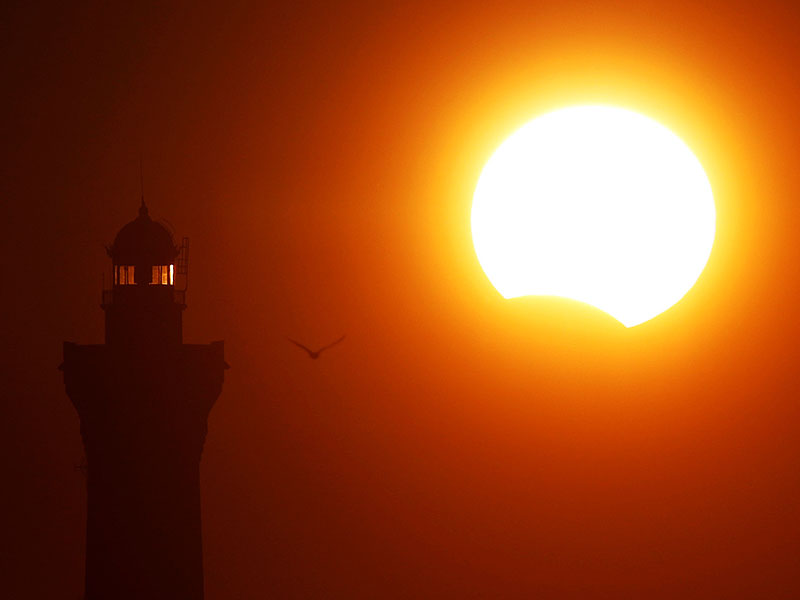 西班牙西北部拜奥纳(Baiona)附近,Cape Silleiro灯塔旁的日偏食景象。