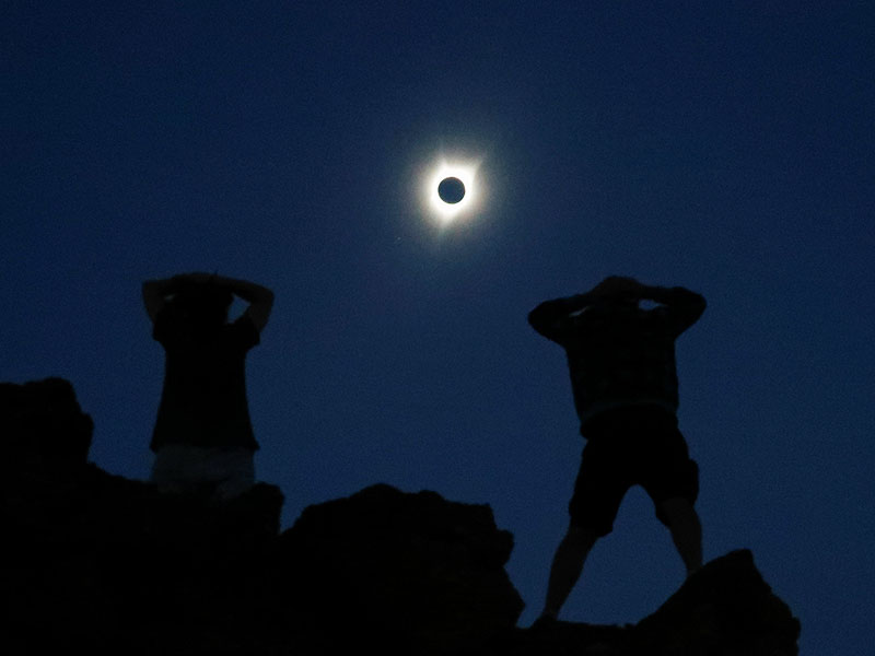 2017年8月21日,俄勒冈州米切尔(Mitchell)附近的John Day化石床国家保护区,两名来自加州的男子在彩绘山峰(Painted Hills)上欣赏全日食。图片来源:视觉中国