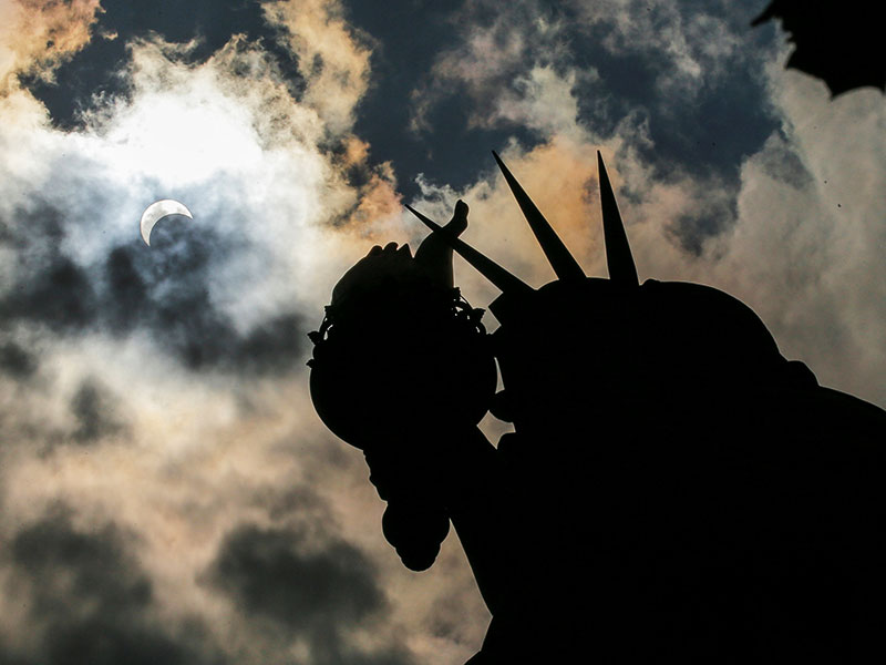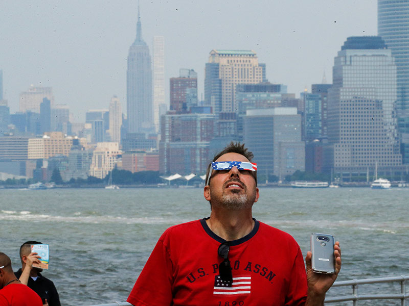 2017年8月21日,美国纽约,一名男子在自由女神岛上观看日食,背后不远处是帝国大厦。