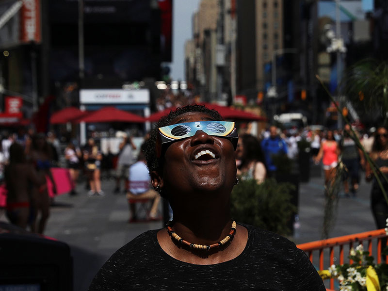 纽约曼哈顿的时报广场(Times Square)上,一名女子抬头看日食。
