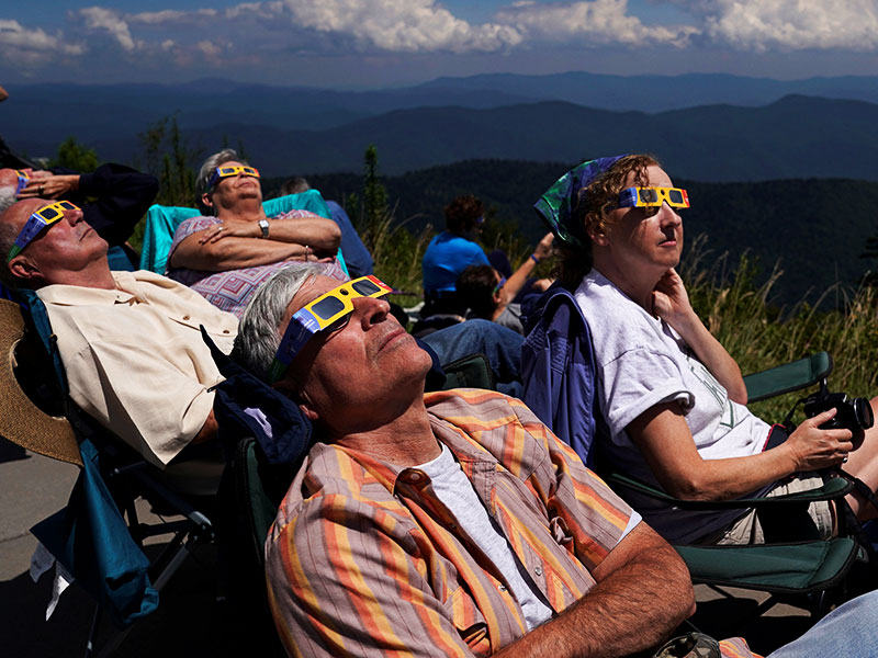 田纳西州大烟山国家公园的克灵曼斯峰上,一群人坐在躺椅上看日食。