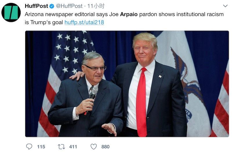《赫芬顿邮报》评论称,特朗普在夏洛茨维尔白人至上主义者游行后不到两星期特赦阿尔帕约,相当于支持后者的种族歧视做法,意在拉拢其政治盟友。