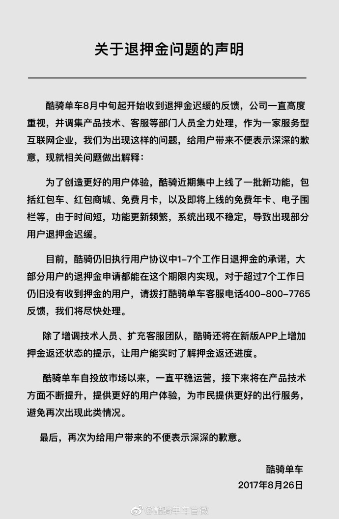 8月26日,在酷骑官方微博中,该公司发表声明称,自8月中旬开始收到退押金迟缓的反馈,出现这一情况的原因是酷骑APP上线了一批新功能,由于时间短,功能更新频繁,系统出现不稳定,导致部分用户退押金迟缓。同时声明表示,酷骑目前仍在执行用户协议中1-7个工作日退押金的承诺,对于逾期仍未收到押金的用户,可拨打客服电话反馈以便尽快处理。