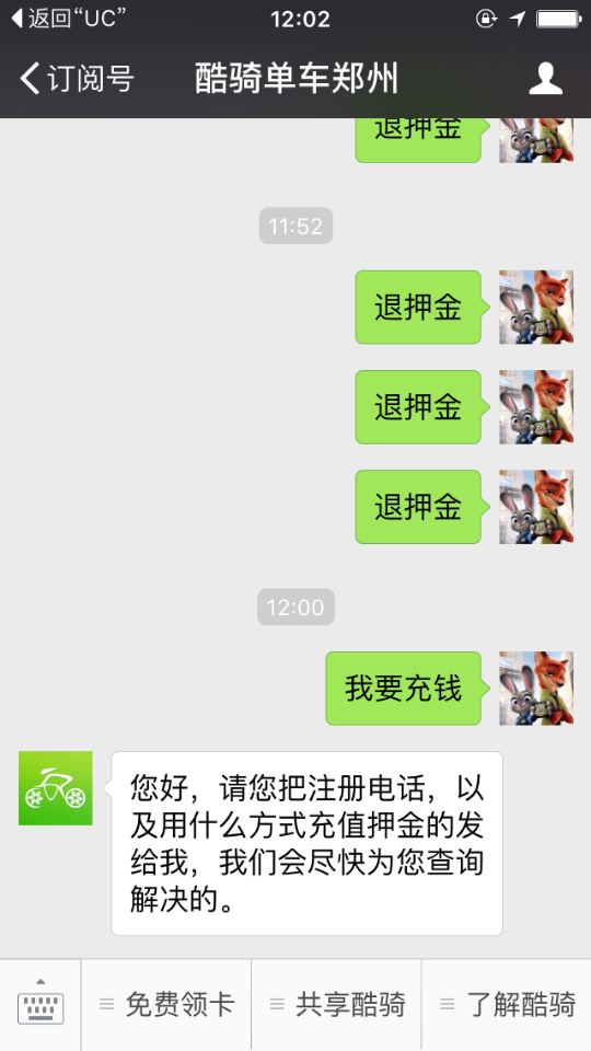 在酷骑单车贴吧里,出现了网友退款方式的图片,即只能在公众号里留下自己的注册电话留下,寻求后台的退款。