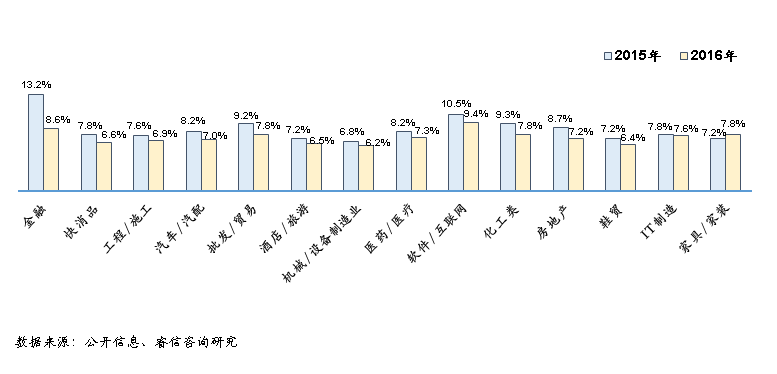 图二:2015-2016年不同行业的薪资增长率情况