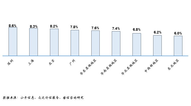 从图三看,一线城市的薪资增长情况以明显优势居于首位,其中深圳的薪资增长率以8.6%位居第一,主要得益于深圳的就业发展情况以低端产业为主,创新研发型企业为主,整体创业环境最佳,人才吸引力优势明显;中西部地区的薪资增长情况略高于东北地区。