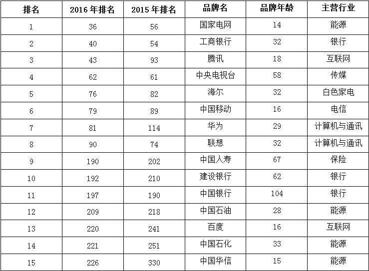 图一:2016年《世界品牌500强》排行榜中15个中国品牌