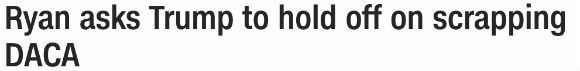 【美众议院议长敦促特朗普不要撕毁儿童移民延期法案】美国众议院议长保罗·莱恩周五表示要极力推动立法,保护无合法身份地位的年轻移民,并敦促特朗普总统不要撕毁“童年抵美者暂缓遣返”计划(DACA)。