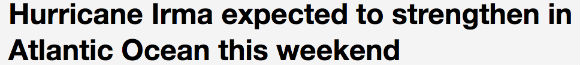 【飓风IRMA周末将加强为5级飓风】强大的飓风IRMA,周末将在东大西洋加强为5级飓风。据美国国家飓风中心预测IRMA将在未来几天形成和增强为“极其危险”的风暴。