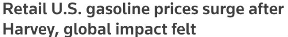 【受哈维飓风影响美国油价飙升】美国零售汽油价格周五飙升至两年来的高位,全球航线也陷入混乱。