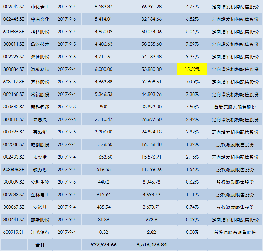 本周限售股解禁明细