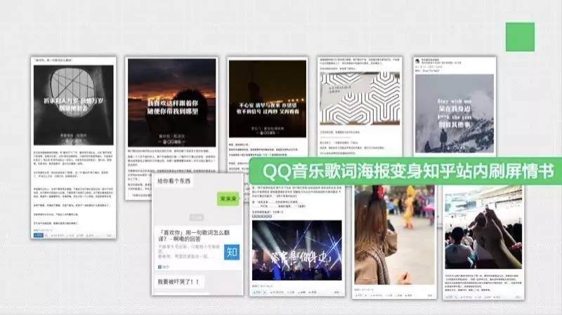 典型的案例则是QQ音乐与知乎的合作。在520的时候产生了一个“‘喜欢你’用歌词怎么翻译”的提问,一问一答之间,随时随地用音乐谱写每个人自己的故事。QQ音乐整个活动产生的海报,在QQ音乐上,在知乎上都形成了刷屏情书的感觉。QQ音乐基于知乎的活动,把所有参与故事分享的人、提到的歌曲做了自己的榜单,这个榜单的播放量在QQ音乐平台上获得了十几万人的播放,400多人对这个网站进行了收藏。