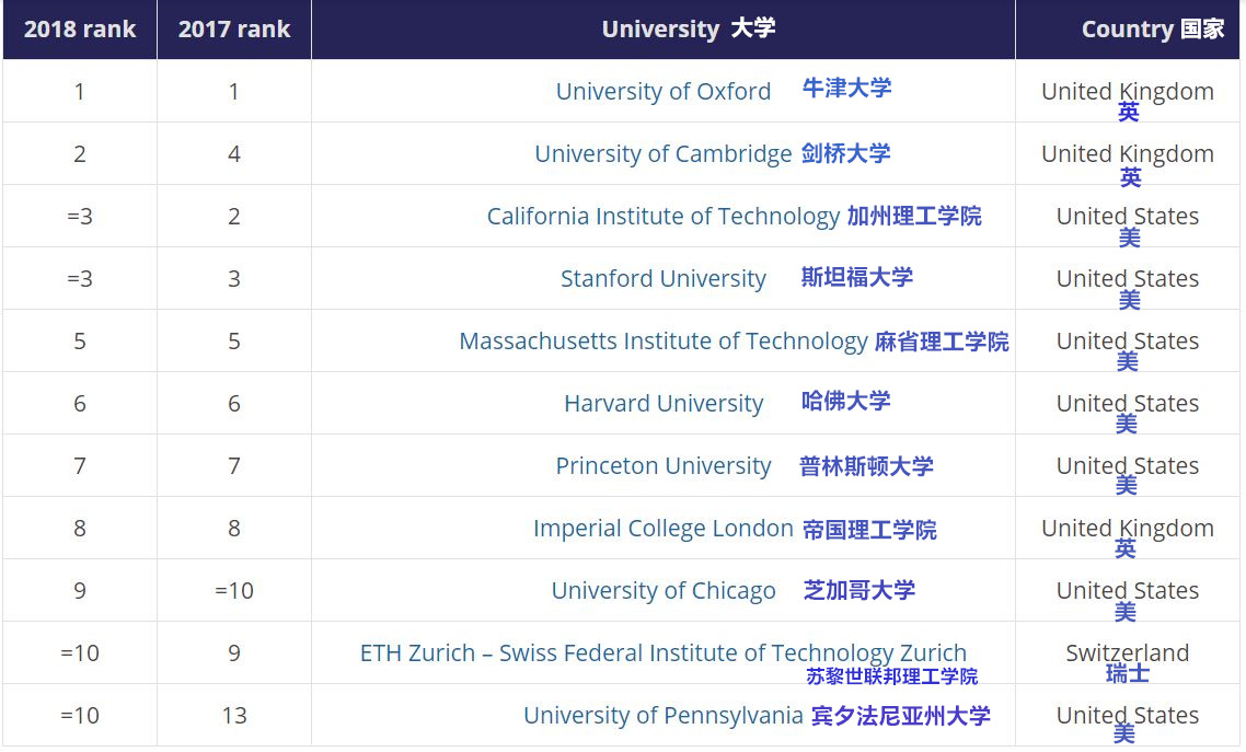 该排名发布13年以来,英国高校首次霸占榜单第一、二位。能获得好成绩,倒不是因为学术水平与其它竞争者拉开差距,而是由于英国高校经费补贴大幅增长。相比之下,加州理工学院和斯坦福大学等劲敌的经费却下降。不过,等正式走完脱欧程序,英国高校经费还能不能维持现有水平还值得商榷。