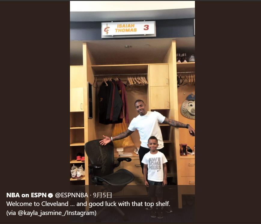 北京时间9月7日,NBA on ESPN的推特转发了以赛亚·托马斯和其儿子在骑士队更衣室的照片,并且调侃了小托马斯的身高。“欢迎来到克利夫兰,希望你能够到衣柜的最上层。”