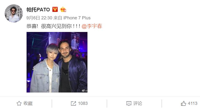 效力于天津权健的亚历山大·帕托,再次在微博上展露“网红”特质。9月6日晚,他晒出了同中国歌手李宇春的合照,并配文“恭喜!很高兴见到你!!”在9月7日早上,他还更新了一张合照,包括演员马思纯。不乏网友评论,称帕托是“被足球运动耽误的网红”。