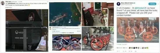 ▲共享单车在英国曼彻斯特被丢弃、破坏。