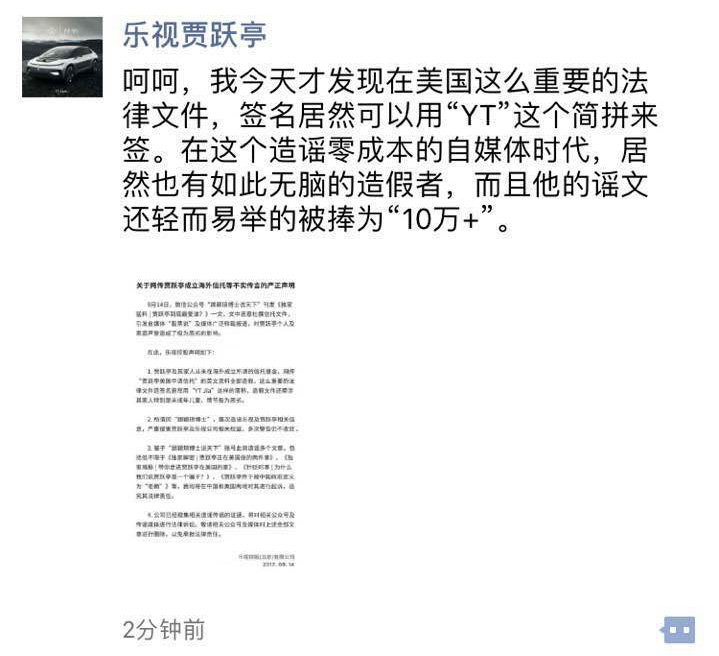 9月14日消息,有自媒体曝光贾跃亭信托文件,称其留给女儿7500万美元,约合5亿人民币。乐视控股发声明称此为恶意杜撰信托文件,贾跃亭当天下午发朋友圈斥其为造假。“在这个造谣零成本的自媒体时代,居然也有如此无脑的造假者,而且他的谣文还轻而易举的被捧为10万+。”