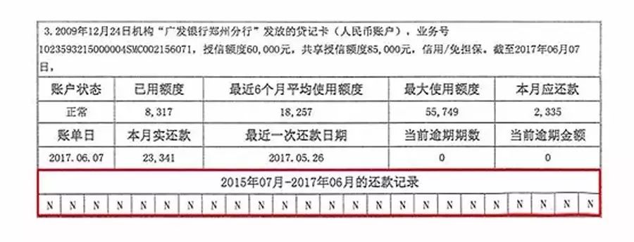 ▲央行征信系统上的信用卡还款记录(N表示没有违约)