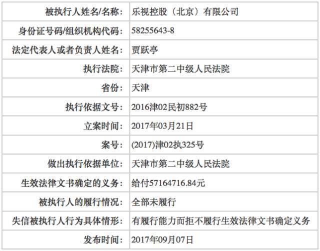 根据全国法院失信被执行人名单,乐视控股涉及的案件有两起,案号分别是(2017)津02执409号和(2017)津02执325号,执行法院均为天津市第二中级人民法院,生效法律文书确定的义务为,给付5008万元和5716万元,合计约1.07亿元。