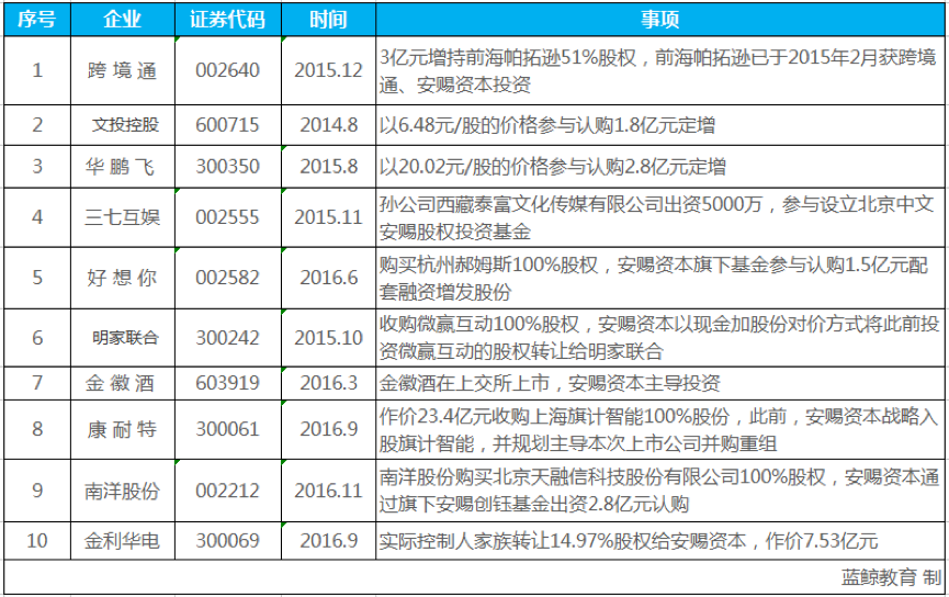 (安赐资本投资A股上市企业一览表)