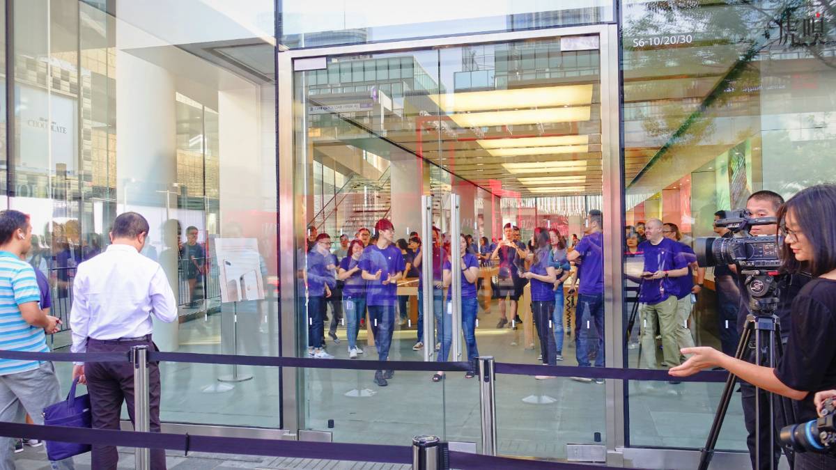 苹果店内的员工准备并没有因为 iPhone 8 惨淡的市场预期,而怠慢原有的准备工作。Apple Store 的员工依然加班加点准备好展示机,在开店前围在一起开会鼓掌,以及邻近 8 点时的欢呼和倒计时。