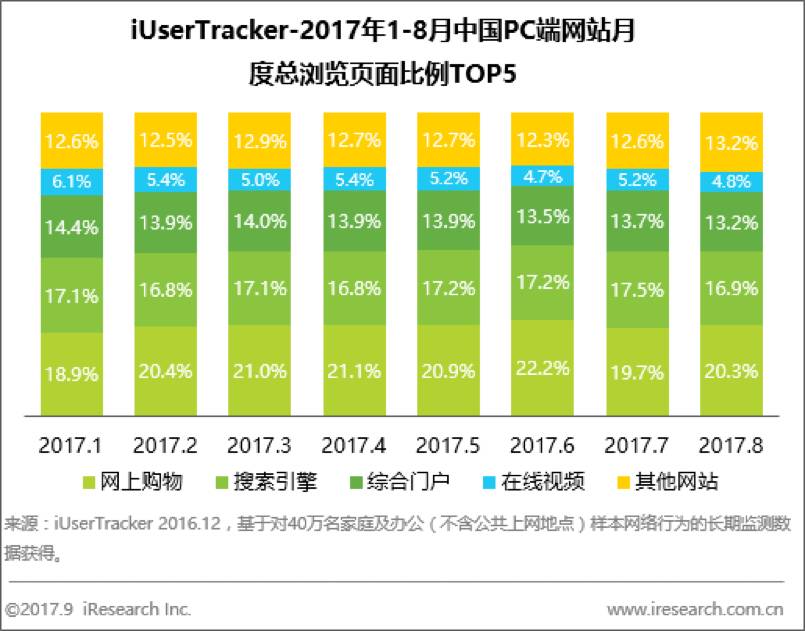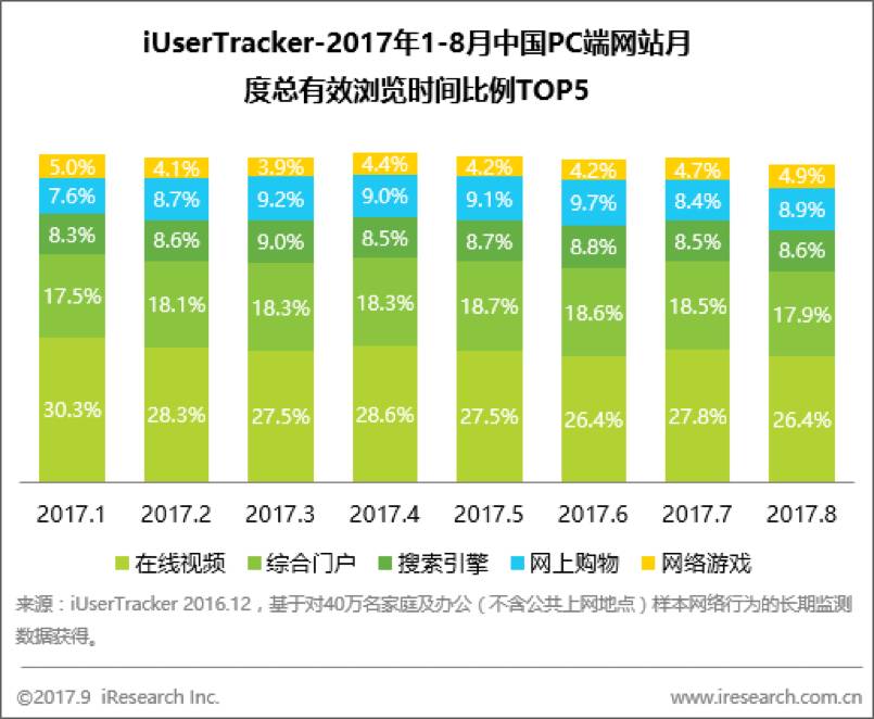 网上购物持续领跑月度总浏览页面比例,在线视频雄踞月度总有效浏览时间榜首