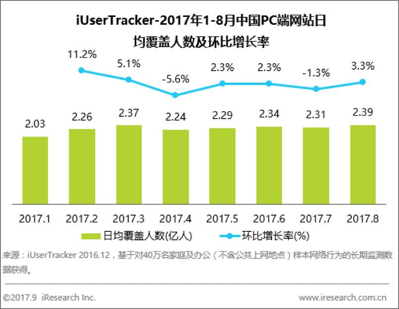 根据艾瑞iUserTracker监测数据,2017年8月中国PC端网站日均覆盖人数为2.39亿人,环比增长3.3%,快开始出现回暖。艾瑞分析认为,PC端网站用户活跃度出现阶段性增长及回落,这可能主要是与周期性的热点事件及促销活动所带动,但整体来看PC段网站用户基本维持稳定。