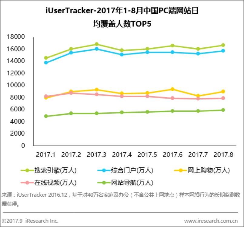 搜索引擎和综合门户依然是中国PC端网站日均流量的主要入口,用户黏性保持较高水平,二者的变化趋势较为一致。其中搜索引擎的日均覆盖人数维持在1.6亿人左右,综合门户的日均覆盖人数在1.5亿人左右,远超其他网站。在线视频类网站的日均流量较为平稳,而网上购物的日均覆盖人数则受促销活动等影响较大。艾瑞分析认为,中国互联网用户的日均覆盖人数受周期性的节点事件影响比较大,但网民的日常网页浏览习惯短期内不会发生改变,PC端网站的流量格局将会保持目前状态。