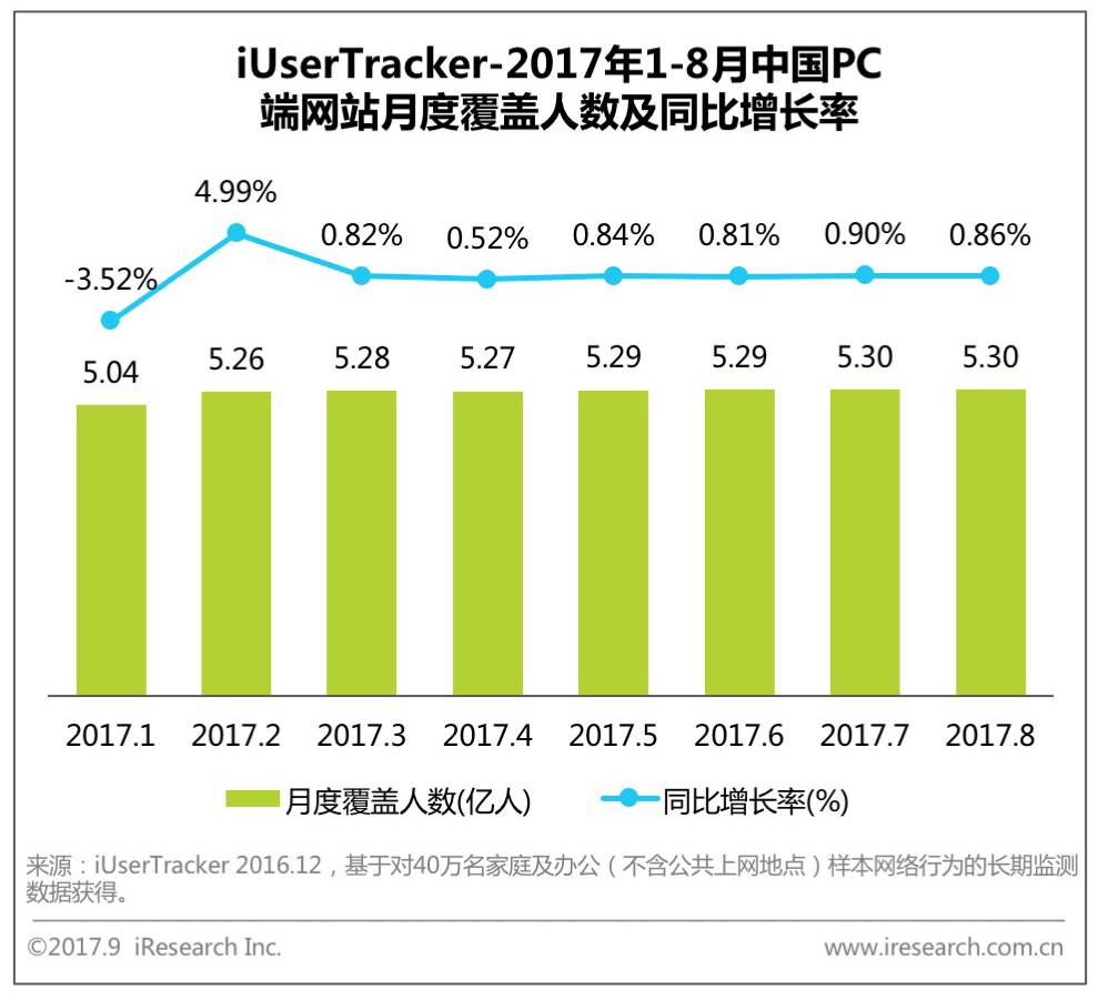根据艾瑞iUserTracker监测数据显示,PC端网站人数在2017年1月-8月总体保持稳定。2017年8月中国PC端网站月度覆盖人数为5.30亿人,同比增长0.86%,变化幅度不大。艾瑞分析认为,随着互联网的普及以及触网年龄的持续低龄化,中国互联网人口红利期逐渐消失,未来PC端网站流量将会持续稳定在目前水平上。