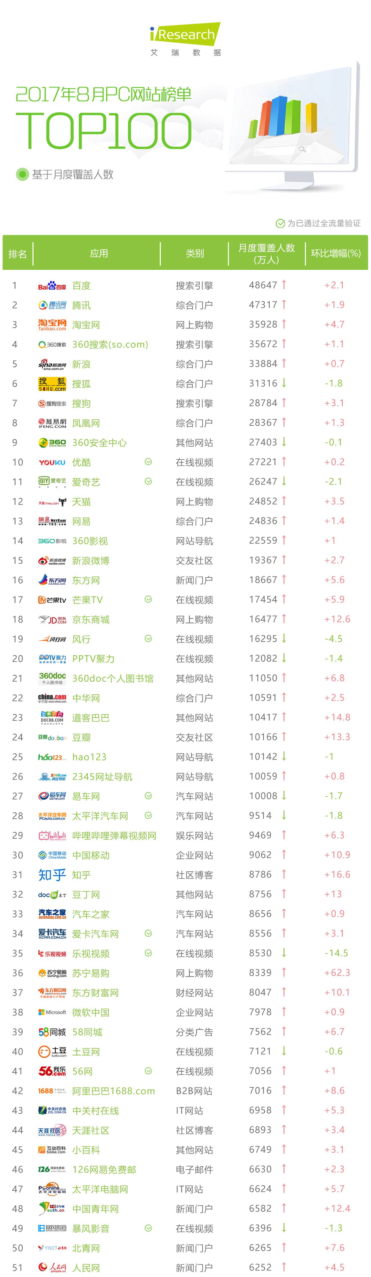 整个8月的PC端网站流量持续保持稳定,仍以搜索引擎及综合门户类网站占比最大,百度月度覆盖人数超4亿,环比增幅2.1%,排名TOP5位都有不同程度环比增长。