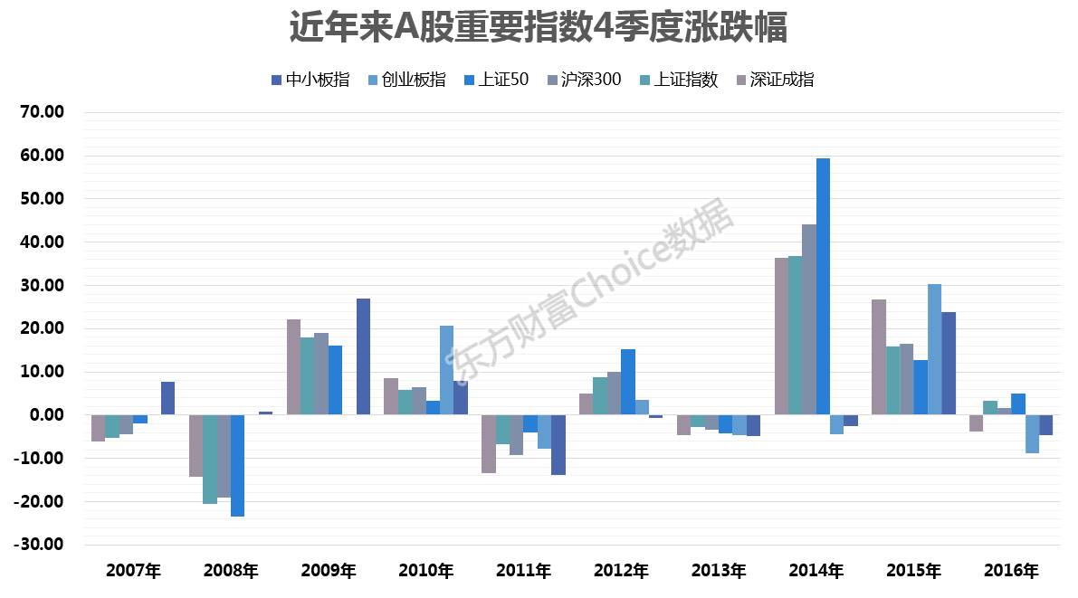 中小板指和创业板指过去10年四季度走势相对较差。其中,中小板指过去10年中有5年表现为下跌,创业板指过去7年中有4年表现为下跌。