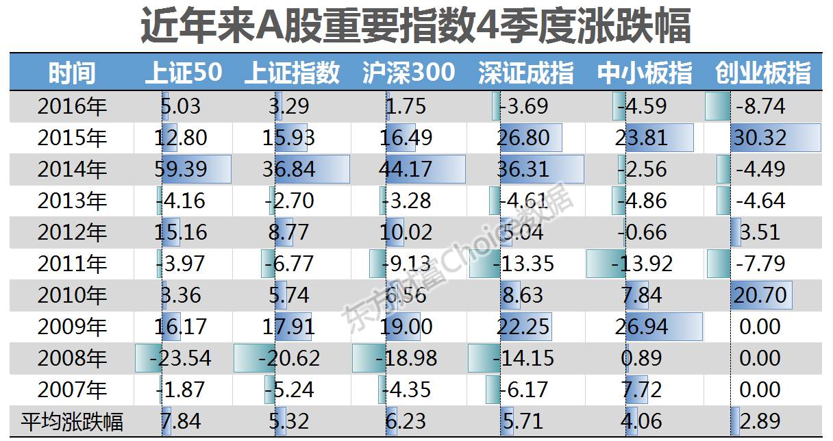 东方财富Choice数据显示,以上证50为代表的白马龙头股,在过去10年中有6年表现为上涨,除了2008年、2011年等这些单边下跌行情的年份外,其余多为红盘报收。过去10年中,四季度平均上涨7.84%,远高于其他指数。