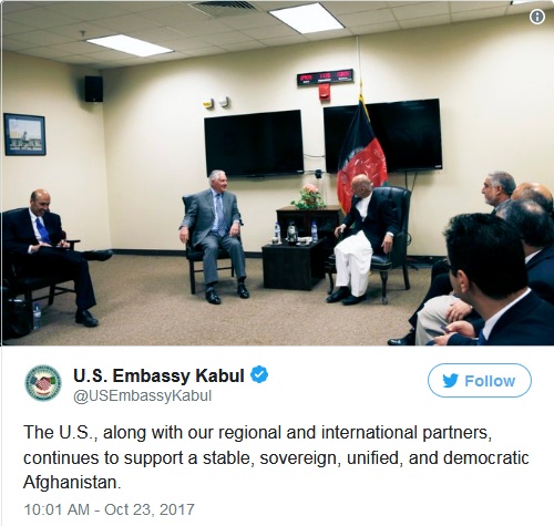 在蒂勒森和加尼周一举行会晤后,美国驻阿富汗大使馆和加尼办公室发表声明称,两人在喀布尔举行了会晤。不过,美国媒体却指出,他们实际上是在距喀布尔约50公里的巴格拉姆美军基地会面的。