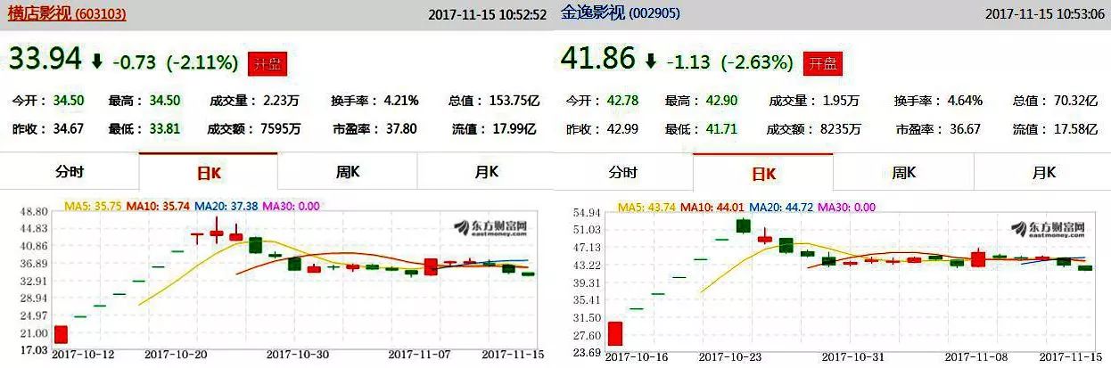 其他的三家院线公司,国资背景的幸福蓝海是去年和同是国资背景的中国电影、上海电影前后脚上市,股价都是一度飙到很高,如今作为次新股,股价已基本跌回正常状态。横店影视和金逸影视是最近刚刚上市,股价还在回调中。