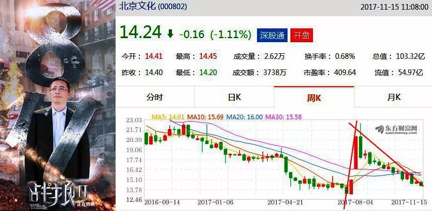 今年疯卖的《战狼2》(分账票房53.1亿)就是由北京文化保底发行,预计利润有1.6亿上下。不过,这个利润未计入前三季度报告。所以,北京文化的前三季度利润仅1890万。股价在《战狼2》票房大好飙升,大股东减持套现后,目前也已逐日跌回原形。