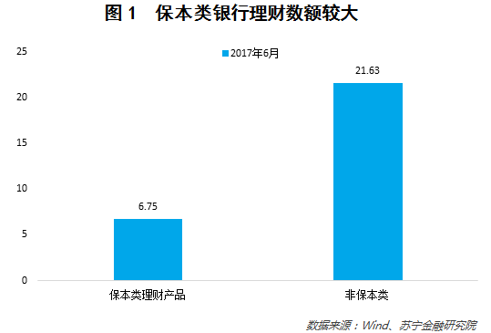 第一,打破刚兑。打破刚兑是资管新规的最重要内容,资管产品都要实行净值型管理。比如根据统计数据,2017年6月银行保本类理财产品规模6.75万亿,占银行理财的比率为23.8%左右,这些刚兑的产品以后要变成净值化产品(参见图1)。