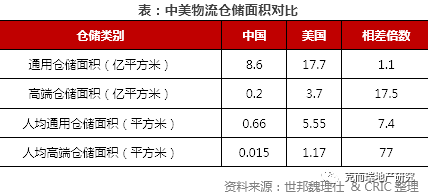 从目前物流仓储的存量来看,我国高端仓储在总量远低于与美国,人均高端仓储占有面积更是与之差距巨大。2015年我国高端仓储设施总量0.2亿方,仅占仓储总量的2.33%,远低于美国20.9%的占比,以未来高标准仓库占仓储总量 20%测算,我国静态看高标准仓库发展至少有 7-10倍空间。